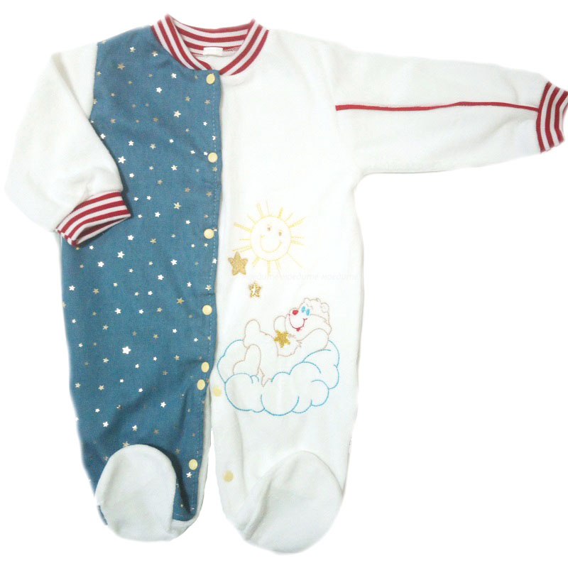 Комбинезон без воротничка, с закрытыми ножками, с рукавами на манжете, спереди и между ножек на кнопочках. Сзади комбинезон однотонный белый из велюра, спереди одна полочка выполнена из джинса и украшена накаткой серебристого цвета в виде цветочков, на второй полочке в виде украшения используется аппликация.